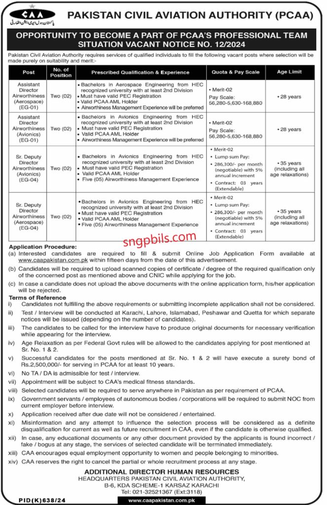 Only Male candidates can apply for this PCAA Jobs September 2024 have Qualification /Experience Required: Bachelors in Aerospace Engineering from HEC recognized university with at least 2nd Division Must have valid PEC Registration Valid PCAA AML Holder