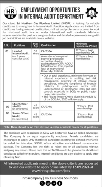 Both male and female candidates can apply for this Sui Northern Gas Pipelines Limited (SNGPL) Career Announcements October 2024 have Qualification /Experience Required: CA/CMA Degree A member of a recognized body of professional accountants qualifying for CPA/ACCA/ MBA (Finance) from reputed local or international University/ Institute 12 Years Post membership OR 17 Years Post membership Out of total experience, minimum five years of relevant experience in auditing and risk management, designing of internal control procedures, effective compliance of financial reliability in public/private sector with understanding of governance, risks and risks controls especially in SOES or public sector projects is essential. The Fit and Proper Criteria given in Schedule IV of the SOE Act, 2023 will also apply, and many more experienced candidates should apply before 16 September 2024.
