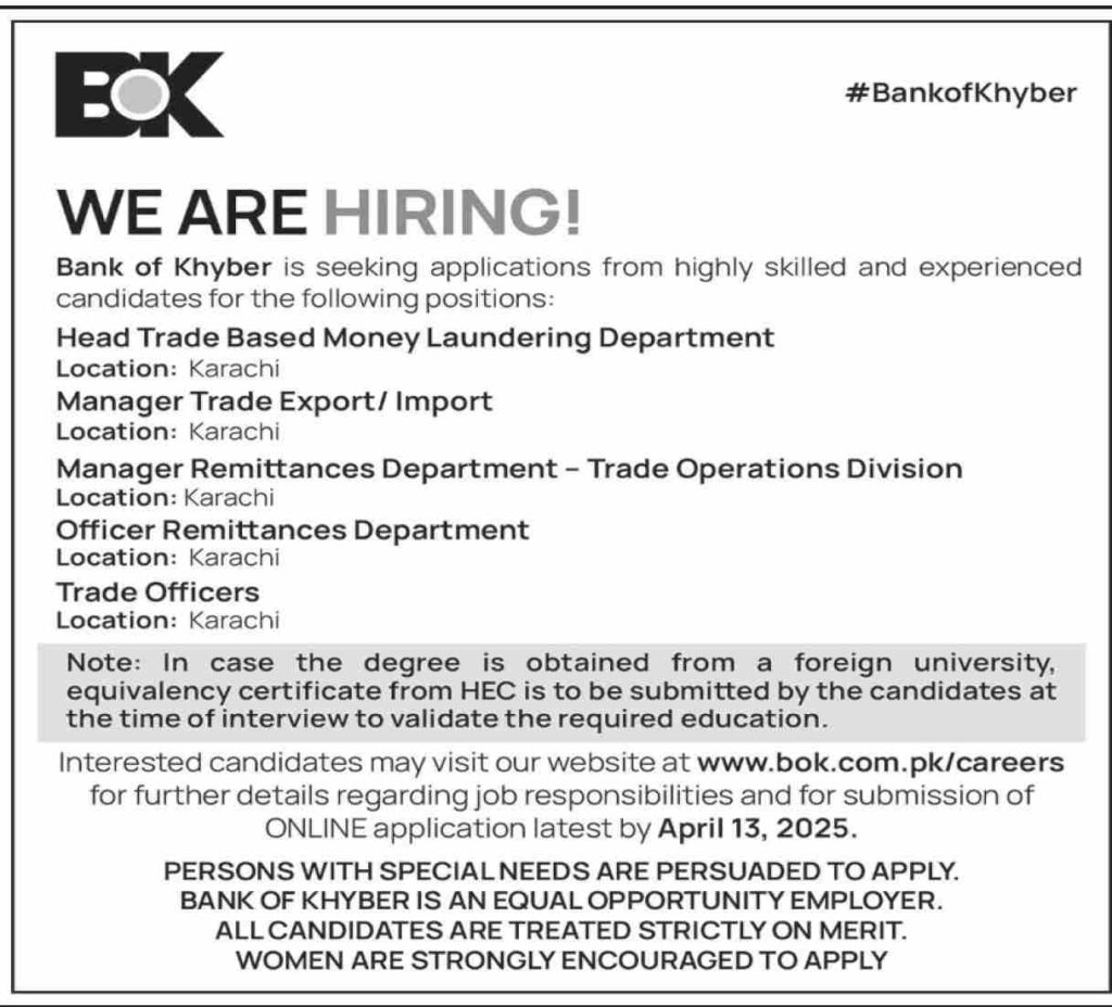 the time of interview to validate the required education. Interested candidates may visit our website at www.bok.com.pk/careers for further details regarding job responsibilities and for submission of an ONLINE application by April 13, 2025. PERSONS WITH SPECIAL NEEDS ARE PERSUADED TO APPLY. BANK OF KHYBER IS AN EQUAL-OPPORTUNITY EMPLOYER. ALL CANDIDATES ARE TREATED STRICTLY ON MERIT. WOMEN ARE STRONGLY ENCOURAGED TO APPLY.