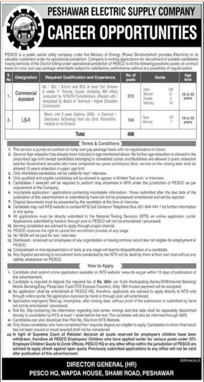 Only male candidates can apply for this Peshawar Electric Supply Company (PESCO) Jobs 2025 Qualification /Experience Required: BA/BSc/B.Com and BCS at least 2nd Division