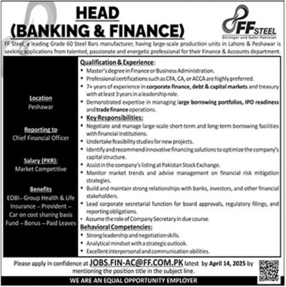 Only male candidates can apply for this FF Steel Unit-2 Head Office Peshawar Pakistan Jobs 2025 Qualification /Experience Required: Master’s degree in Finance or Business Administration. Professional certifications such as CFA, CA, or ACCA are highly preferred. 7+ years of experience in corporate finance, debt & capital markets, and treasury with at least 3 years in a leadership role. Demonstrated expertise in managing large borrowing portfolios, IPO readiness, and trade finance operations, and more experienced candidates should apply before 14 April 2025.