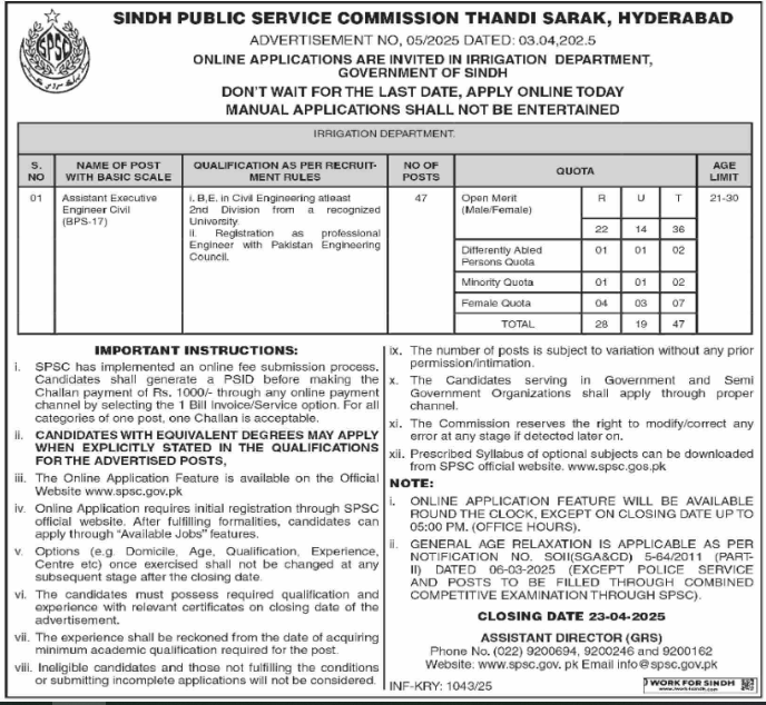 Only male candidates can apply for this Sindh Public Service Commission Thandi Sarak Jobs 2025 Qualification /Experience Required: B,E. in Civil Engineering atleast 2nd Division from a recognized University Registration as professional Engineer with Pakistan Engineering Council, and more experienced candidates should apply before 23 April 2025.